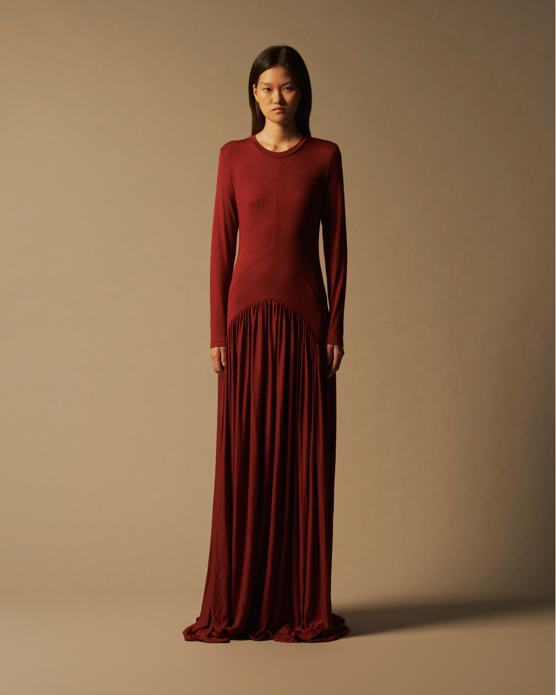 A floor-length silhouette with a fully gathered skirt, presenting fluid movement and statuesque balance. Crafted in black and bordeaux hues from soft modal blend fabric for structured drape and comfort.