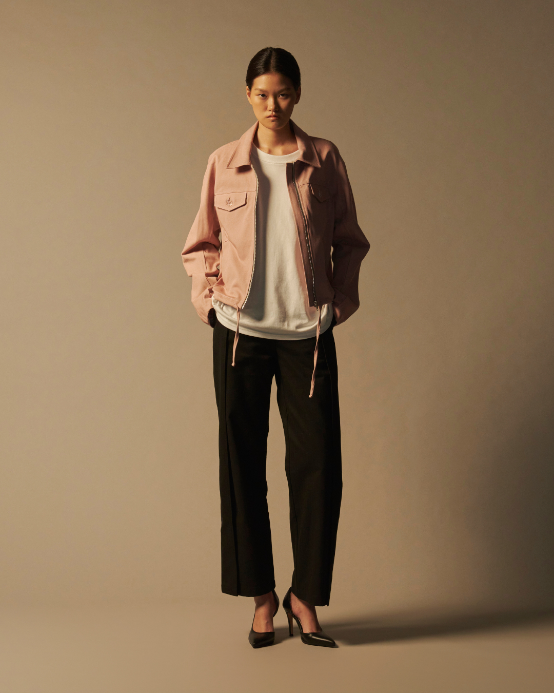 A structured zip-up jacket featuring rounded sleeves, adjustable drawstring finish, and chest and side pockets for functional versatility. Presented in powder pink and black cotton, combining soft tactility with a sharp silhouette. Made in South Korea.
